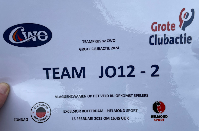 CWO JO12-2 heeft als team het meeste ‘Grote Club Actie’ loten verkocht en mogen bij de opkomst van de teams op het veld met vlaggen zwaaien en de spelers welkom heten.