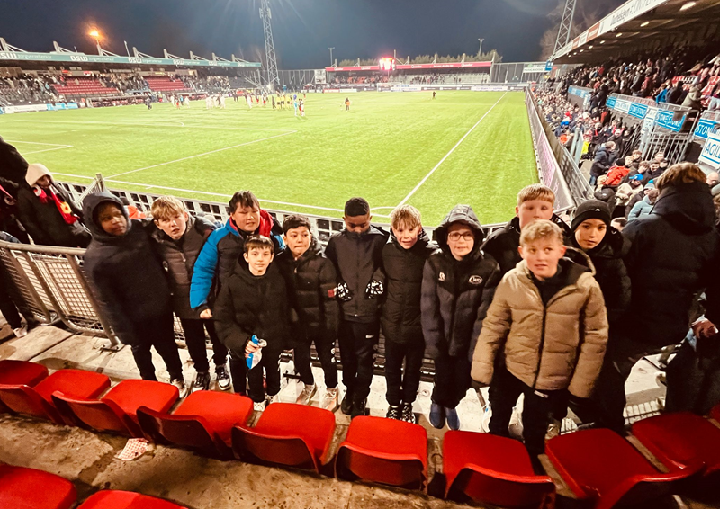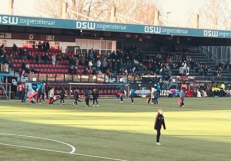 Na het zwaaien mochten ze een mooi plekje uitzoeken op de tribunes en de wedstrijd bekijken.