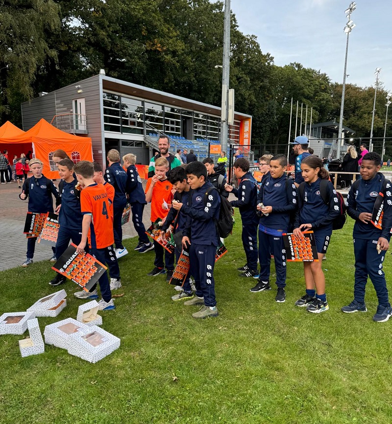 een goed verzorgt broodje. De kinderen vlogen daarna alle kanten op. Naar het panna veldje, op de foto met Dutchy, zoeken naar een goed plekje langs het veld. Komen ze aanfietsen? Waar moeten we staan? Het enthousiasme is duidelijk aanwezig.Dan is het zover. Even voor 18.00 komt de KNVB oranje bus aanrijden waarna na enkele minuten de spelers van Oranje het veld opkomen onder luid gejuich van de vele Oranjefans.