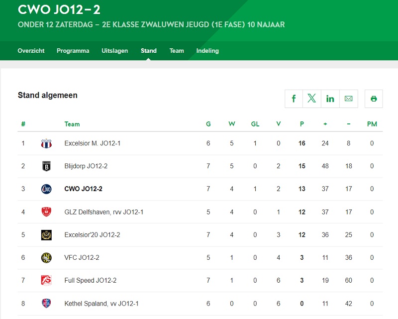 Natuurlijk krijgen alle CWO-ers een dik compliment voor deze voorsprong. Maar we willen wel “waken” voor gemakzucht. Dat betekend er voor blijven gaan maar ook liggen er mogelijkheden in de duels om door feller “op de bal” te zijn er sneller bal bezit kan zijn.