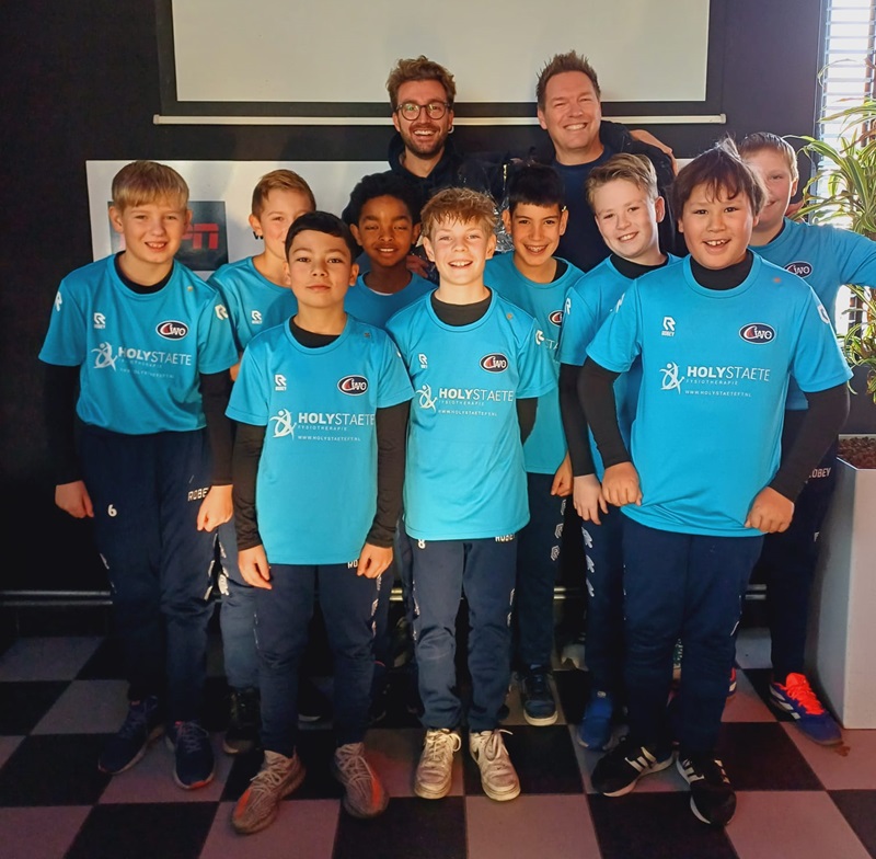 Het is zaterdagochtend 30 november. Vandaag om 11.30 de stadsderby UIT tegen de eeuwige rivaal Zwaluwen JO12-2. Helaas zijn Darrell en Nikodem vandaag afwezig. We lopen er dit seizoen mooi bij, dankzij Holystaete, in mooie nieuwe trainingspakken en lichtblauwe shirts. We verzamelen dan ook iets eerder dan normaal om de sponsor Holystaete te bedanken met een teamfoto voor in de praktijk.