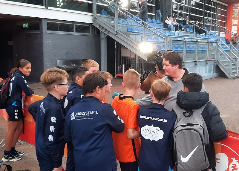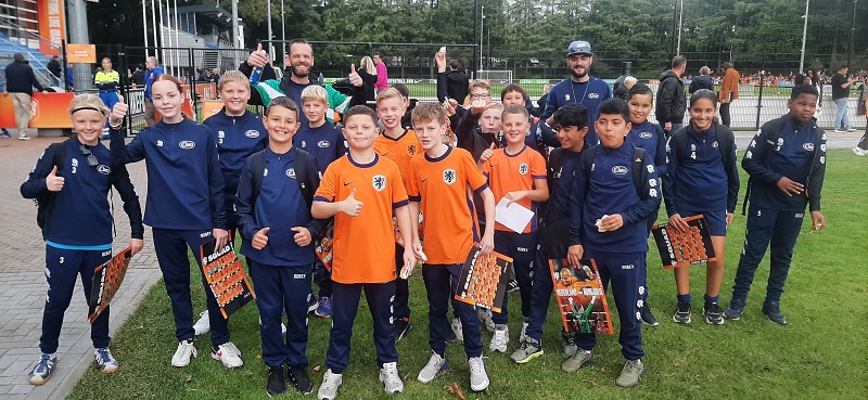 een goed verzorgt broodje. De kinderen vlogen daarna alle kanten op. Naar het panna veldje, op de foto met Dutchy, zoeken naar een goed plekje langs het veld. Komen ze aanfietsen? Waar moeten we staan? Het enthousiasme is duidelijk aanwezig.Dan is het zover. Even voor 18.00 komt de KNVB oranje bus aanrijden waarna na enkele minuten de spelers van Oranje het veld opkomen onder luid gejuich van de vele Oranjefans.