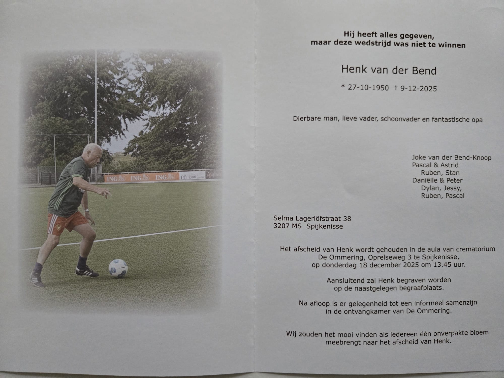 Donderdag 18 december zal Henk begraven worden, na afloop is er gelegenheid tot een informeel samenzijn in de ontvangkamer van De Ommering.