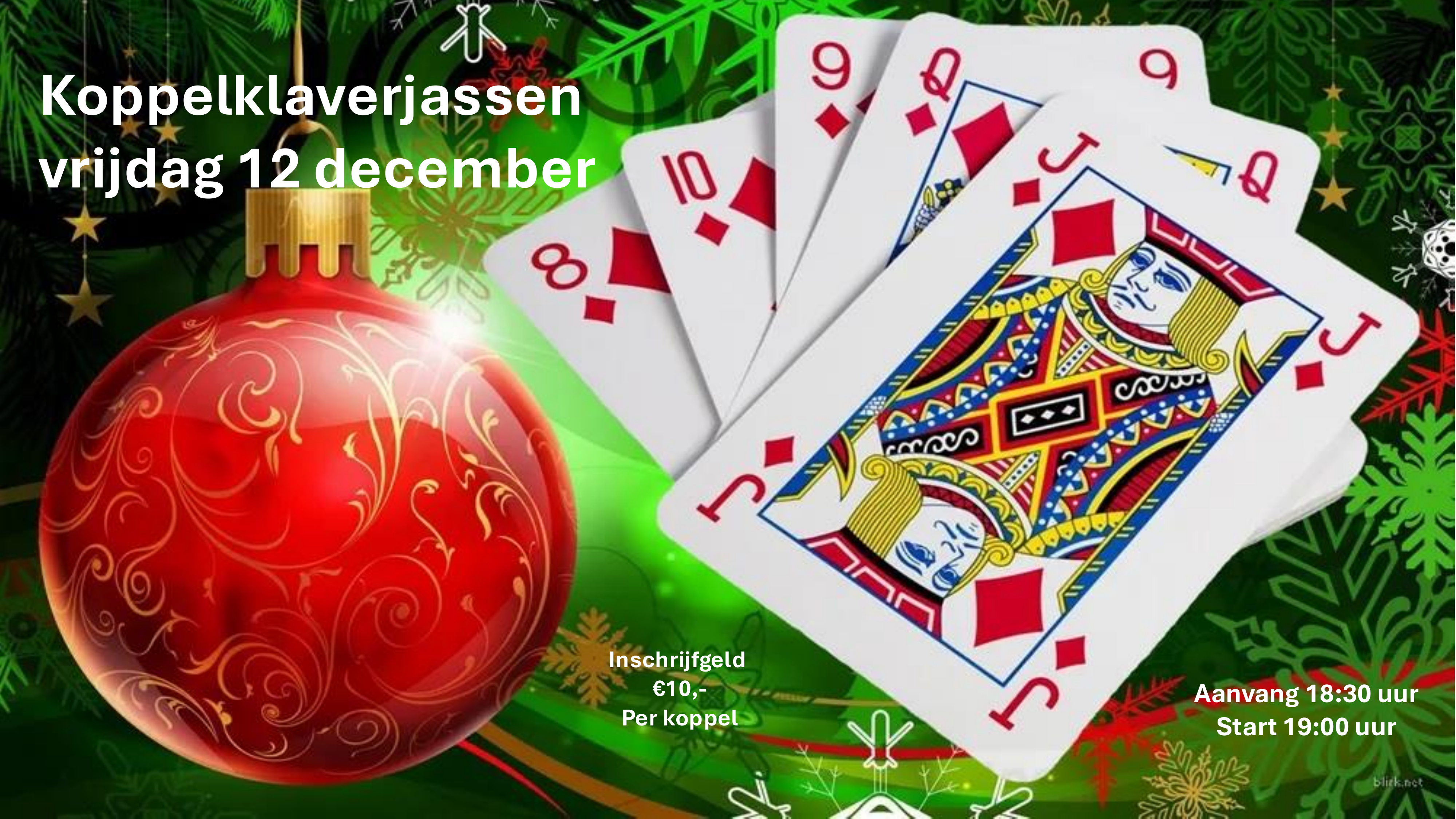 Het is weer zover! Op vrijdag 12 december organiseren we een gezellige avond koppelklaverjassen in de kantine van CWO.De deuren openen om 18:30 uur, e...