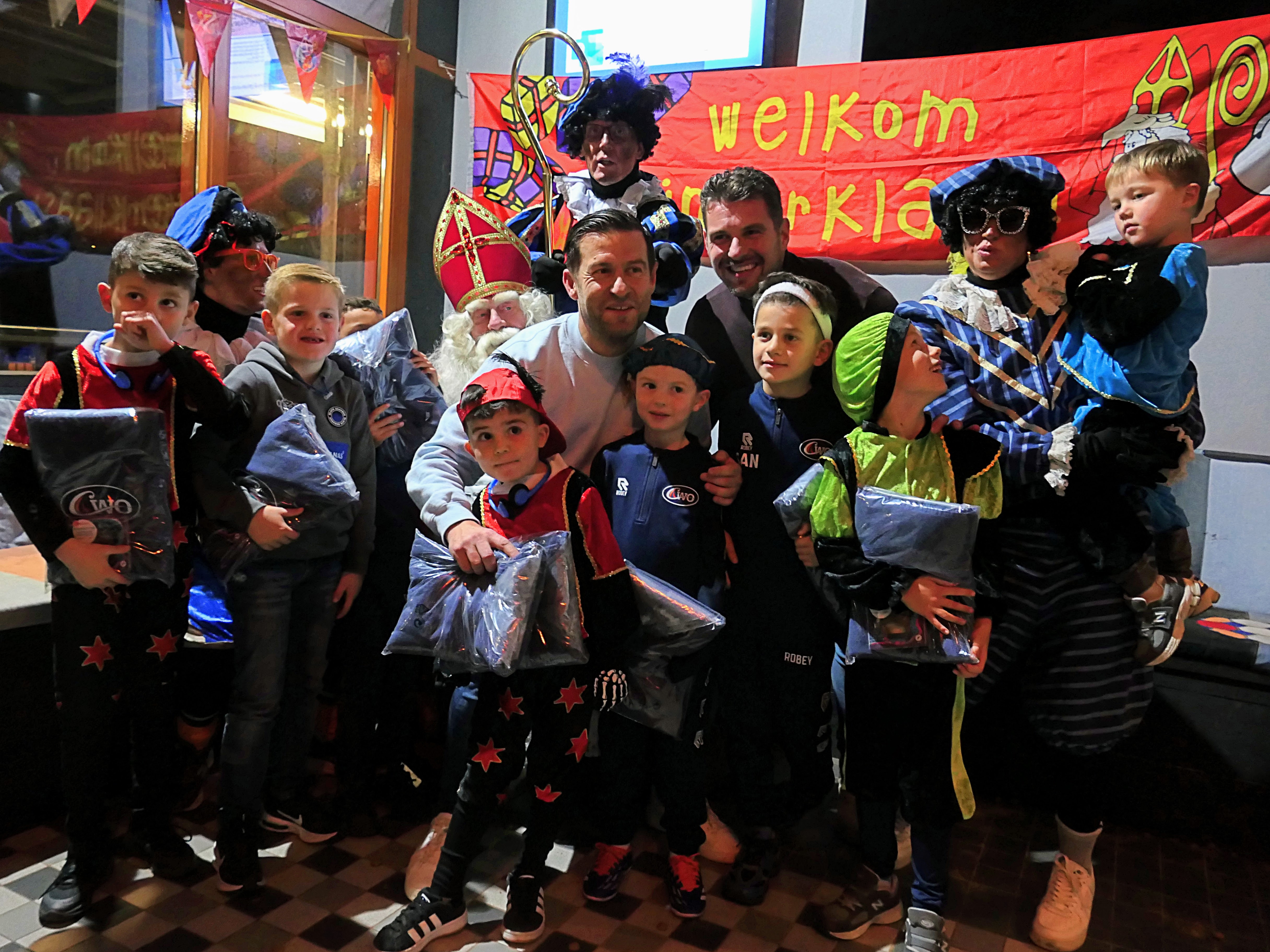Eerst mogen alle VoetbalsGoal kinderen bij Sint komen. Een handje van Sint, pepernoten van de hoofdpiet en dan krijgt elke kind een CWO-tasje waar nu een chocoladeletter in zit, maar waar zij na de wedstrijd en training hun vieze voetbalschoenen in kunnen doen. Nog even met de hele groep op de foto bij Sint en de Pieten en dan zijn de ‘grote’ jongens en meisjes aan de beurt.
