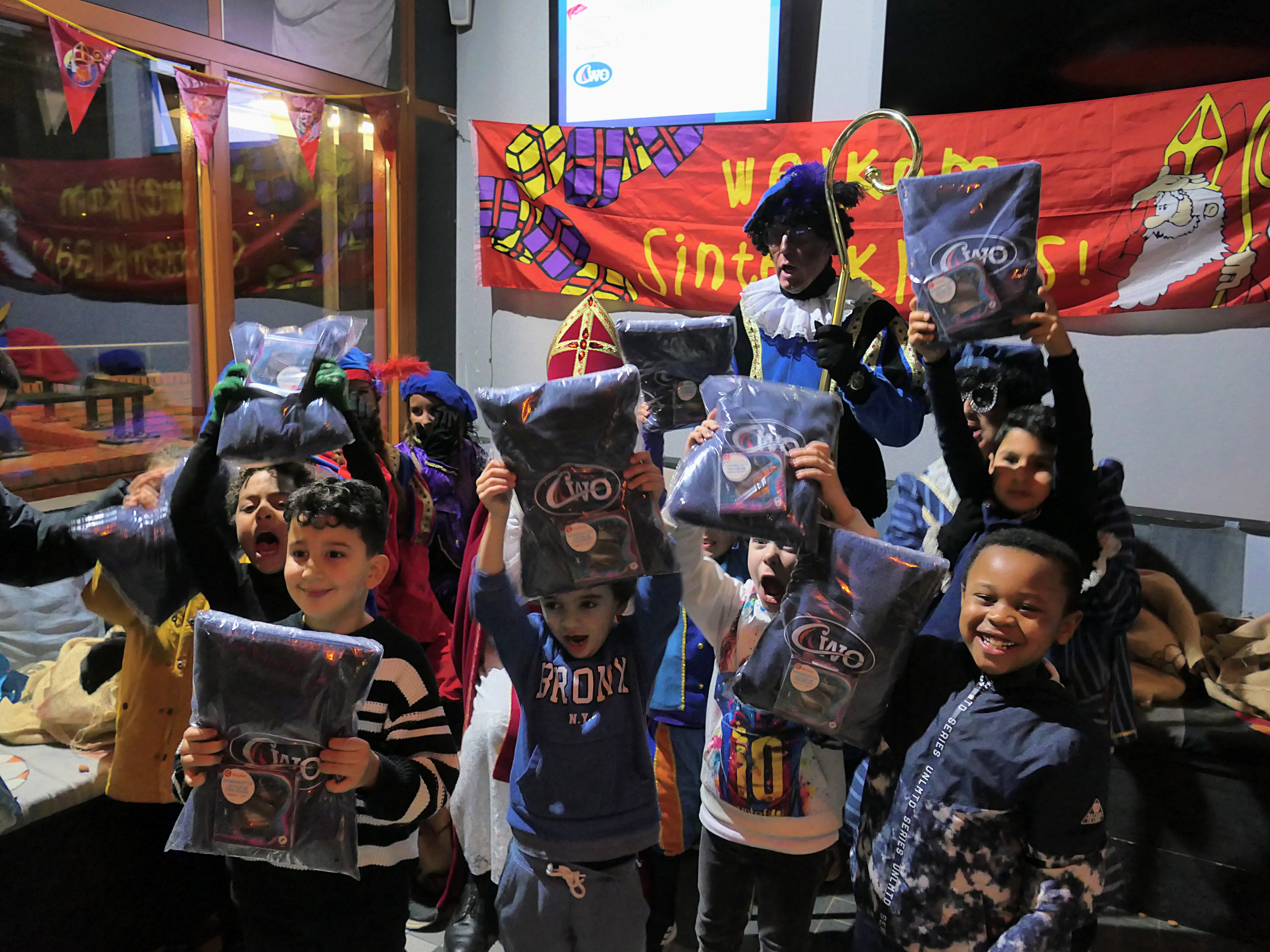 Het wordt duidelijk dat Sint vanwege het slechte weer veilig is opgehaald is door de brandweer en politie, zodat er bij CWO toch feest kan zijn. De DJ zorgt voor Sinterklaasliedjes en de Pieten dansen vrolijk in de rondte. Dan komt het moment waar stiekem elk kind op wacht: het cadeau!